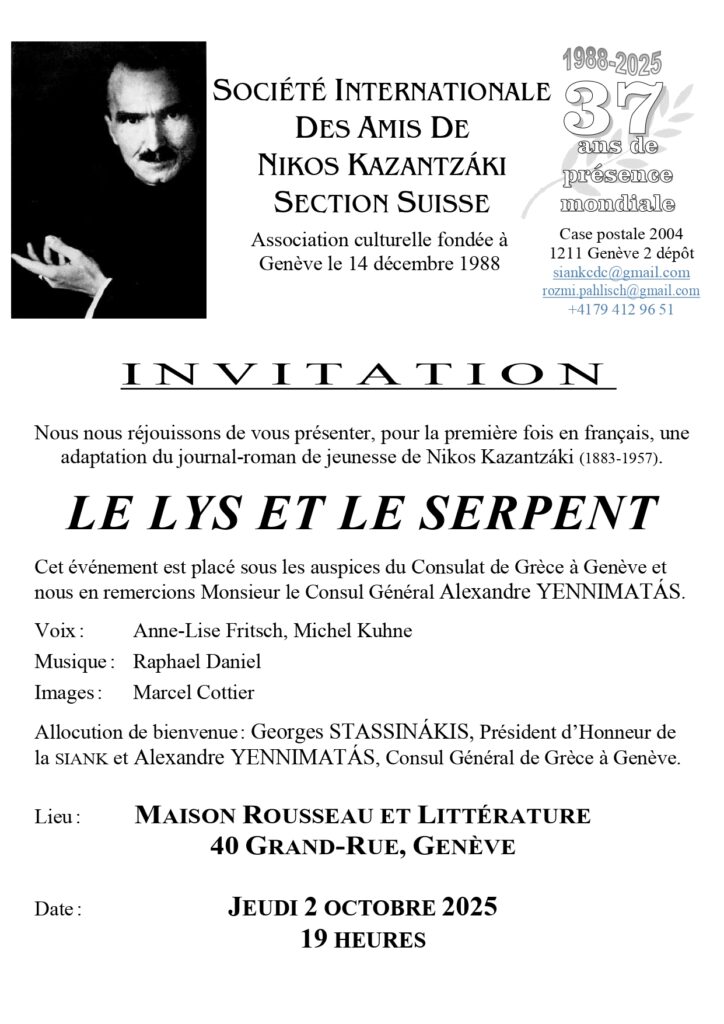 Ο Σύλλογος “Hephaestus Wien–Österreichisch/Griechischer Integrationsverein“ και η “Διεθνής Εταιρεία Φίλων Νίκου Καζαντζάκη – (ΔΕΦΝΚ )” σας προσκαλούν σε διαδικτυακή εκδήλωση – αφιέρωμα στον Νίκο Καζαντζάκη, την Κυριακή 2 Νοεμβρίου 2025, ώρα 18:00 CET, 19:00 τοπική Ελλάδος, με θέμα: “80 ΧΡΟΝΙΑ ΑΣΚΗΤΙΚΗ”