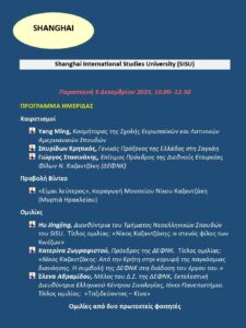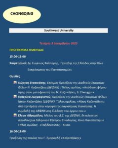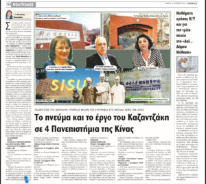 Από τις 28 Νοεμβρίου έως τις 5 Δεκεμβρίου 2025 η Διεθνής Εταιρεία Φίλων Νίκου Καζαντζάκη (ΔΕΦΝΚ), διοργάνωσε εκδηλώσεις για τον μεγάλο συγγραφέα στην Κίνα, με την αιγίδα της Πρεσβείας της Ελλάδος. Τη ΔΕΦΝΚ εκπροσώπησαν οι: Γ. Στασινάκης, Επίτιμος Πρόεδρος της ΔΕΦΝΚ, Κατερίνα Ζωγραφιστού, Πρόεδρος της ΔΕΦΝΚ, και Έλενα Αβραμίδου, Μέλος του ΔΣ της ΔΕΦΝΚ- Εκτελεστική Διευθύντρια του Ελληνικού Κέντρου Σινολογίας στο Ιόνιο Πανεπιστήμιο. Οι εκδηλώσεις περιελάμβαναν παρουσίαση του Νίκου Καζαντζάκη και του έργου του στα τμήματα Νέων Ελληνικών των Πανεπιστημίων: University of International Business and Economics (UIBE), Πεκίνο· Beijing Foreign Studies University (BFSU), Πεκίνο· στο Shanghai International Studies University (SISU), Σαγκάη, όπου πραγματοποιήθηκε ημερίδα στην οποία παρευρέθηκε ο Γενικός Πρόξενος της Ελλάδος στη Σαγκάη κ. Σπυρίδων Κρητικός και ο Κοσμήτορας της Σχολής κ. Yang Ming. Τέλος, στο Southwest University, στο Τσονγκτσίν, πραγματοποιήθηκε ημερίδα για τον Κρητικό συγγραφέα στο Κέντρο Αρχαίου Ελληνικού και Κινεζικού Πολιτισμού (ΚΕΛΚΙΠ), παρουσία του Πρέσβη της Ελλάδος στην Κίνα Δρ Ευγένιου Καλπύρη, του Διευθυντή του ΚΕΛΚΙΠ καθ. Cui Yanqiang, της επικεφαλής και στελεχών του Γραφείου Δημόσιας Διπλωματίας της Πρεσβείας, και του Γενικού Γραμματέα του ΚΕΛΚΙΠ καθ. Wang Yοng που είχε την ευθύνη της διοργάνωσης από πλευράς του Πανεπιστημίου. Στο BFSU και στο SISU προβλήθηκε το ντοκιμαντέρ «Είμαι λεύτερος» παραγωγής Μουσείου Νίκου Καζαντζάκη. Ευχαριστούμε θερμά τη Διοίκηση του Μουσείου που μας το παραχώρησε.