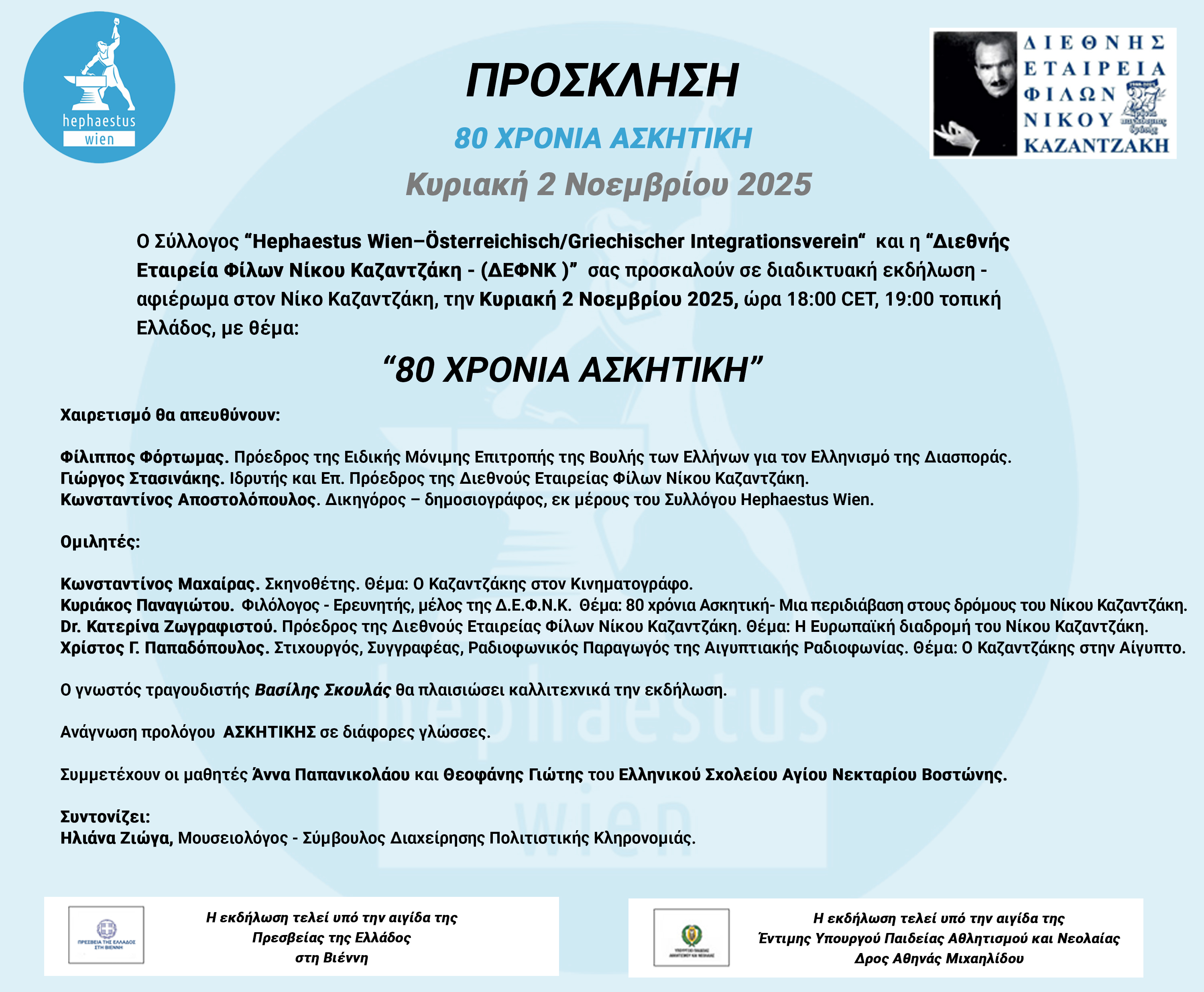 Ο Σύλλογος “Hephaestus Wien–Österreichisch/Griechischer Integrationsverein“ και η “Διεθνής Εταιρεία Φίλων Νίκου Καζαντζάκη – (ΔΕΦΝΚ)” σας προσκαλούν σε διαδικτυακή εκδήλωση – αφιέρωμα στον Νίκο Καζαντζάκη, την Κυριακή 2 Νοεμβρίου 2025, ώρα 18:00 CET, 19:00 τοπική Ελλάδος, με θέμα: “80 ΧΡΟΝΙΑ ΑΣΚΗΤΙΚΗ”