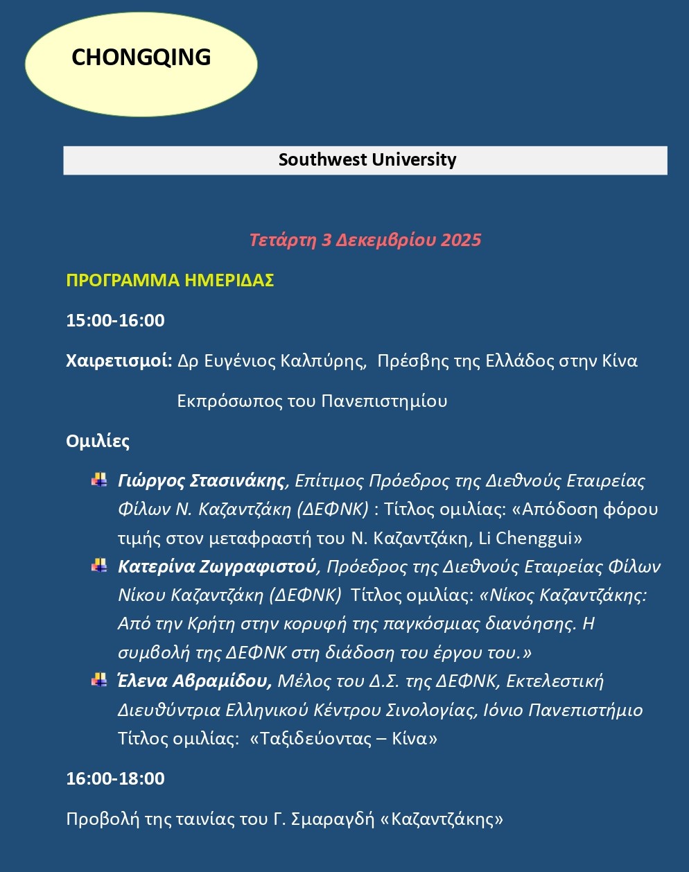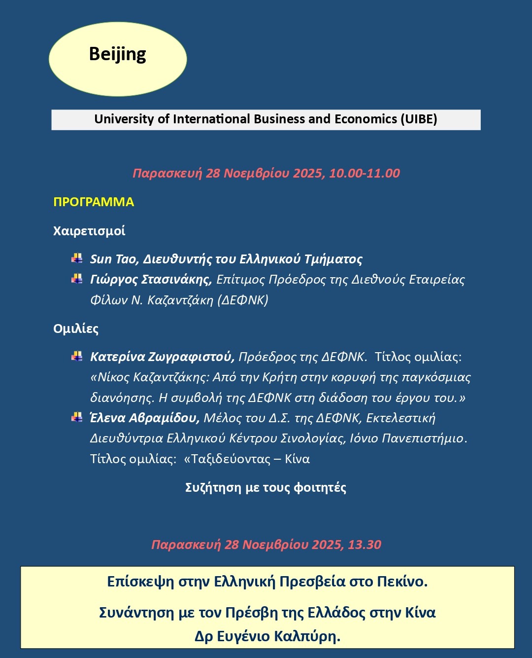 Ο Γ. Στασινάκης, Επίτιμος Πρόεδρος της ΔΕΦΝΚ και Πρεσβευτής Ελληνισμού θα δώσει διάλεξη στις 5 Νοεμβρίου 2025, τοπική ώρα 12.00, στη Φιλοσοφική Σχολή του Πανεπιστημίου του Πάλε, με θέμα: «Νίκος Καζαντζάκης, ένας σύγχρονος στοχαστής». Την εκδήλωση έχει θέσει υπό την αιγίδα της η Ελληνική Πρεσβεία στο Σεράγεβο. Θα ακολουθήσει συζήτηση.